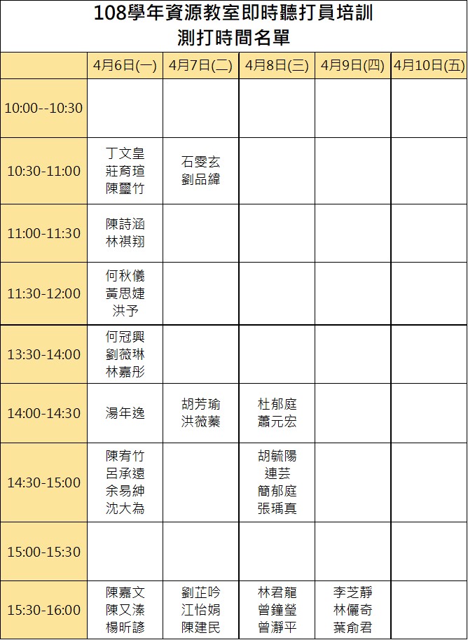 (一)測打時間+說明會小測驗共計約30分鐘,請提早10分鐘至資源教室辦理報到,測打當日未到者,視同放棄機會。