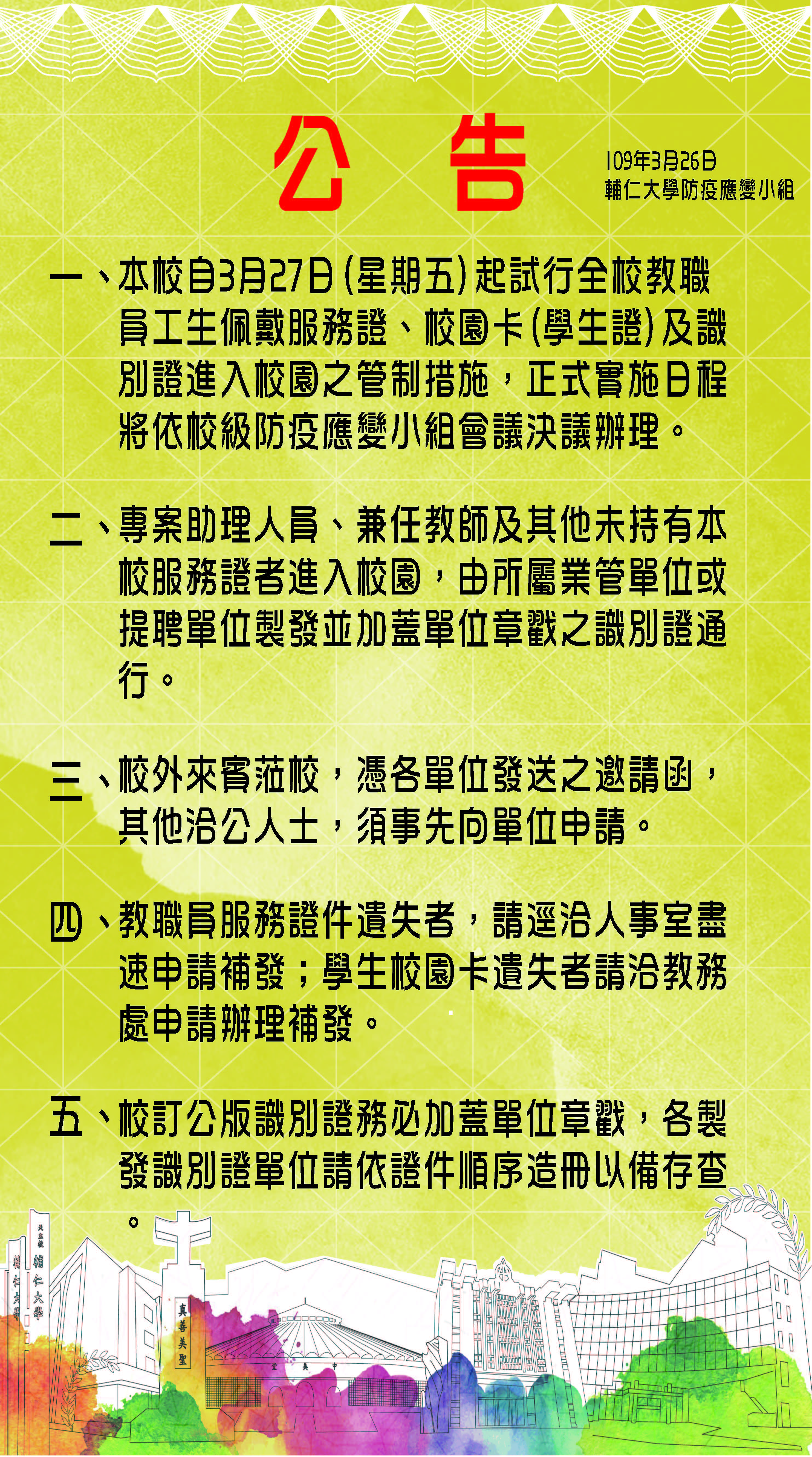 輔仁大學自3/27起試行全校教職員工生配戴服務證、校園卡(學生證)及識別證進入校園之管制措施。
