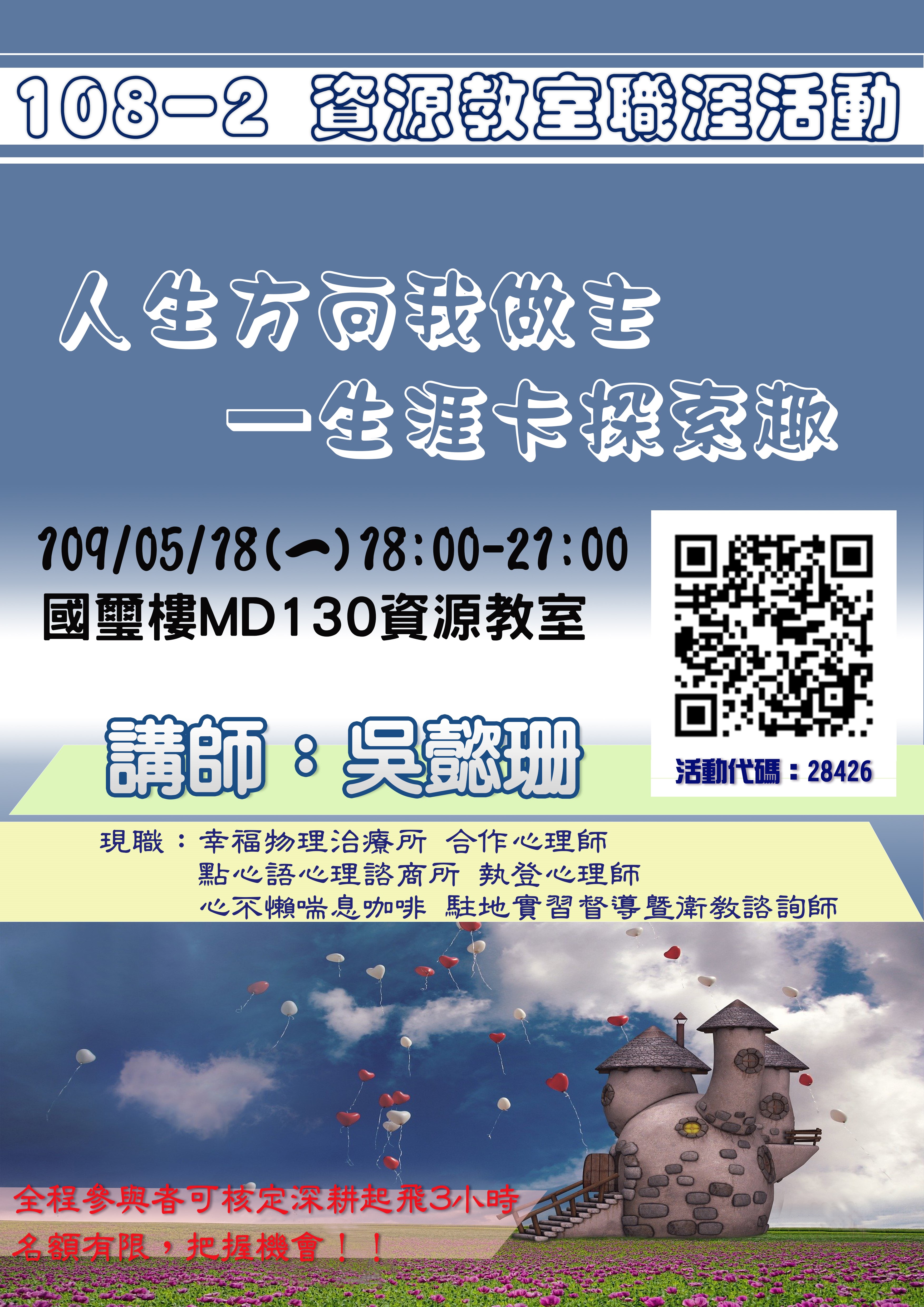 時間:109/5/18(一)18:00-21:00 地點:國璽樓MD130資源教室 參加對象限資源教室特教生 名額:12名 全程參與者可核定深耕起飛3小時 為利活動順利進行,請提早自行用餐,活動備有飲品。