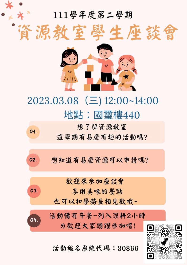 📢111-2資源教室學生座談會報名 2023-02-23• 行政公告 111-2資源教室學生座談會 想了解資源教室這學期有甚麼有趣的活動嗎? 想知道有甚麼資源可以申請嗎? 歡迎來參加座談會 享用美味的餐點 也可以和學務長相見歡哦~ 活動備有午餐~ 歡迎大家踴躍參加唷! 時間:3月8日12:00-14:00 地點:國璽樓440教室 活動代碼:30866 活動備有餐點 可列入深耕起飛時數2小時 報名網址: http://activity.dsa.fju.edu.tw/Activity.jsp?activityID=30866 附件下載 圖片1.jpg