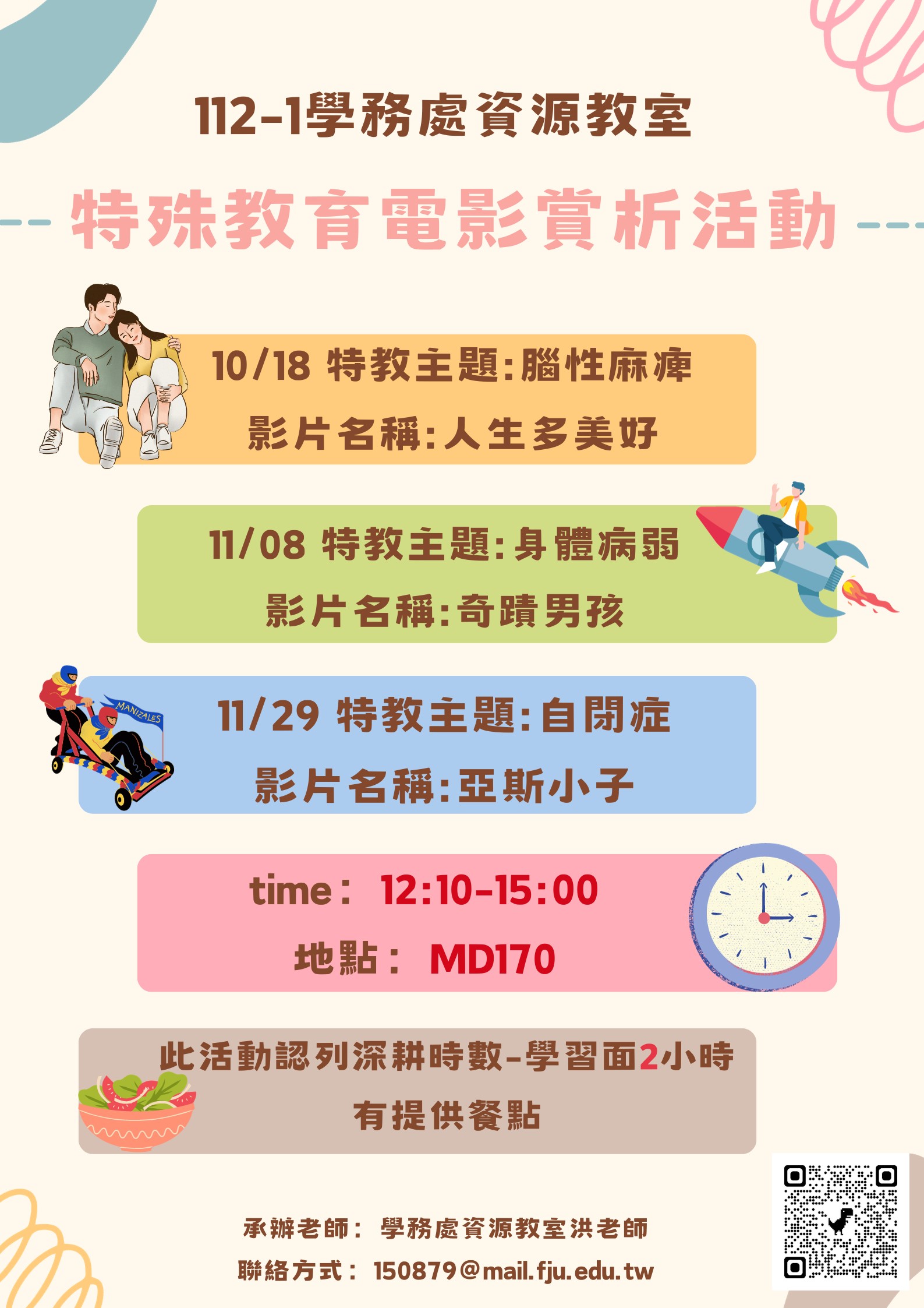 透過特殊教育相關電影,認識特殊教育學生、推廣有愛無礙的友善校園。本學期規劃辦理三場次! 日期: 10/18腦性麻痺:人生多美好 11/08身體病弱:奇蹟男孩 11/29自閉症:亞斯小子 時間:1210-1500(含午餐) 地點:國璽樓MD170教室 點我報名囉